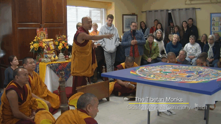 Tibetan monks perform the Mandala Closing Ceremony in Manchester.